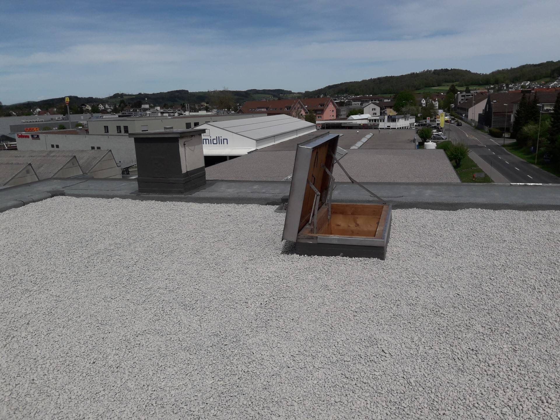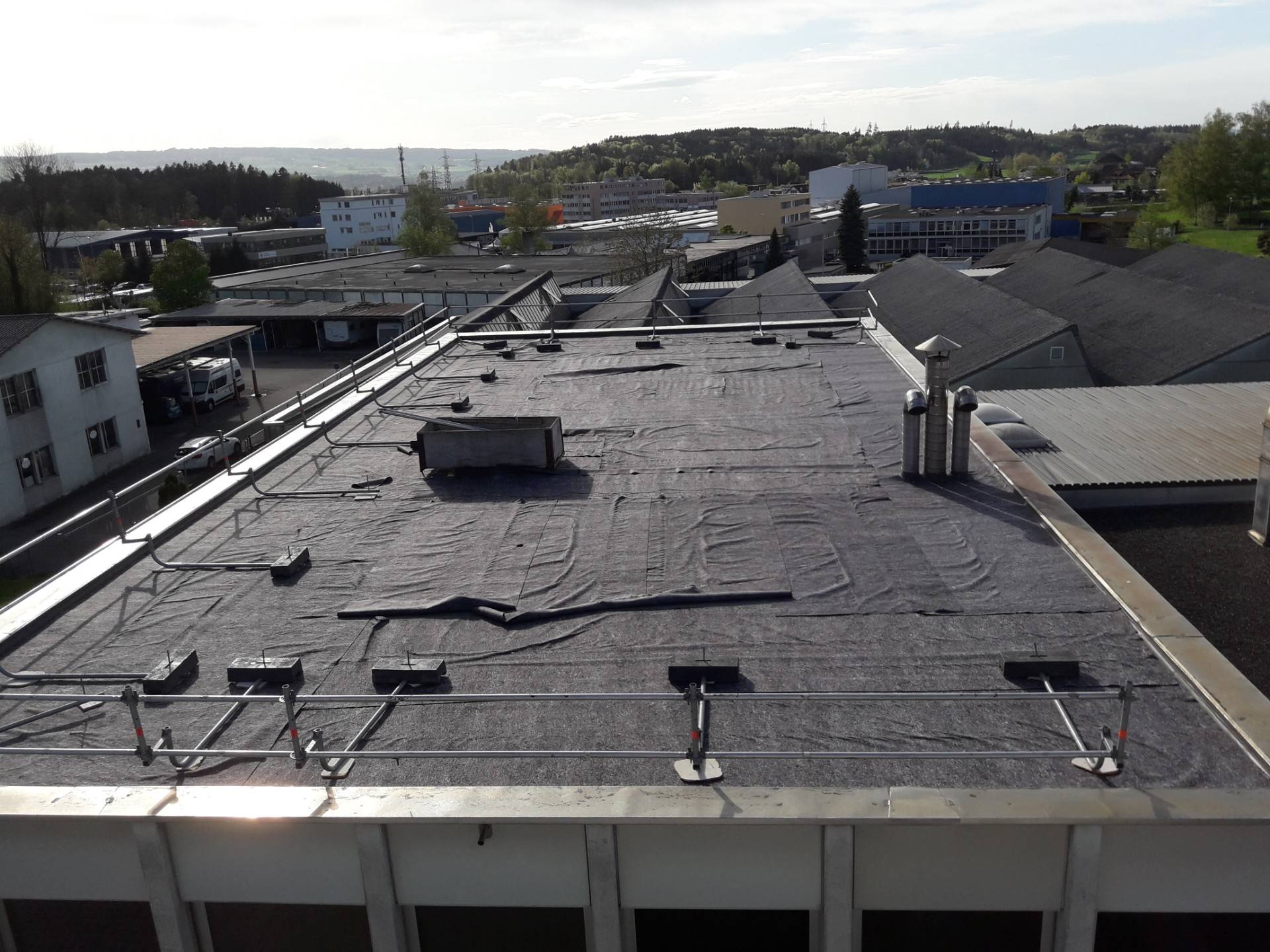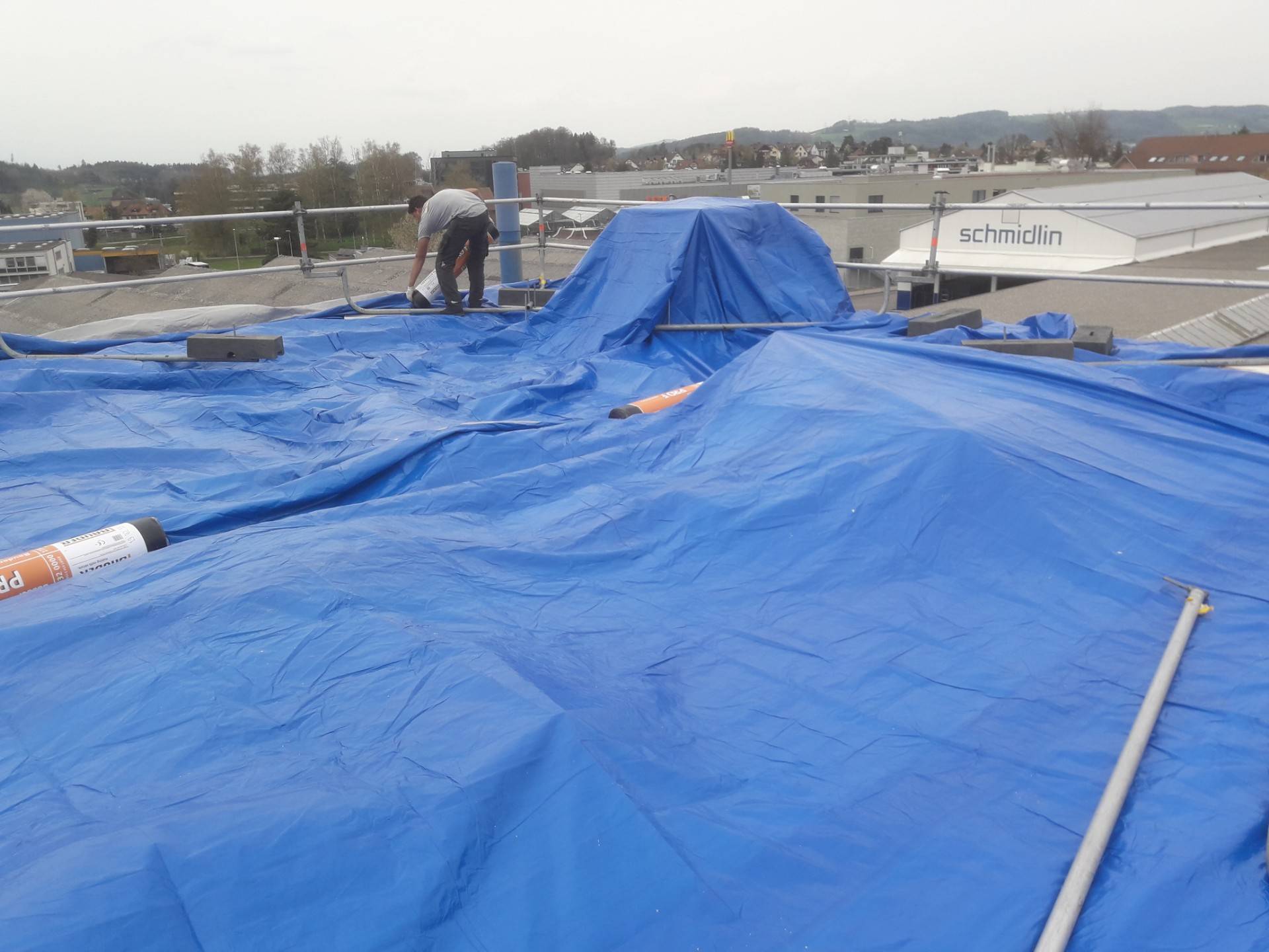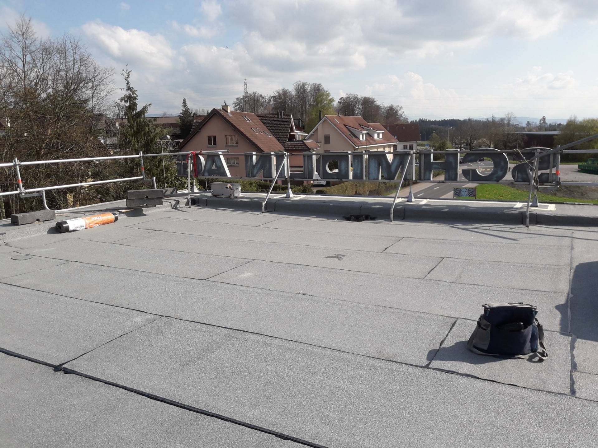Schmidlin AGAffoltern a.A.Objekt: Totalsanierung Industriehallendach Fläche: 120 m2 Material: PIR Isolation, Elastomerdichtungsbahnen, Flüssigkunststoff HAGMANS Spezialiät: kompletter Neuaufbau inkl. Abdichtungen Anschlüsse Ausführungszeitraum: März bis April 2019